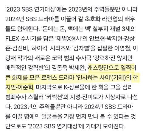 내일 SBS 연기대상 시상자로 나올 예정인 한지민-이준혁
