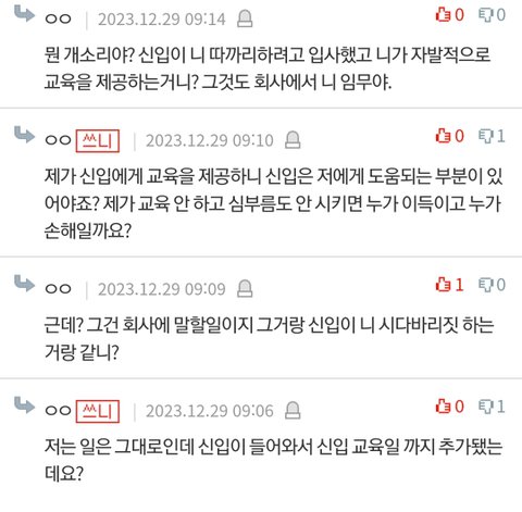 쓰니 진상이네. 너도 신입시절에 교육받았잖아ㅡ?? 그때 너도 따까리 짓 했음?? 신입교육 시키는게 부당하다 생각하면 회사에 얘기해. 꼭 회사에 말 못하는 것들이 만만한애한테 갑질하지.ㅋㅋ 그러다 너 갑질로 문제생긴다. 딱봐도 문제될거 같으니 팀장이 경고 준거 같은데 못 알아듣는 지능..