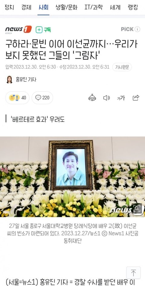 구하라는 불법촬영 범죄 피해자고 문빈은 이유는 모르겠지만 본인이 남한테 피해줬던 건 전혀 없던 사람인데 룸 들린거 들통나서 백억대 위약금 물어줘야 하는거+사회적 체면 무너진 거 때문에 자살한 사람이랑 동일선상에 놓네 이게 맞냐? 진짜 연예대상에서 광대들 꼴깝떠는 것도 그렇고 개역겨움 하는짓들만 보면 ㅅㅂ열사 추모야 아주 ㅋㅋㅋ 즈그들도 다 룸 들리는 게 일상이라 이선균이 유독 불쌍했나봄 그러니까 가세연이나 언론사는 못건드리고 만만한 대중한테 발작질하지 걔네한테 뭐라했다 지네도 털리니까 ㅋㅋㅋ