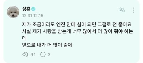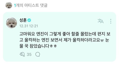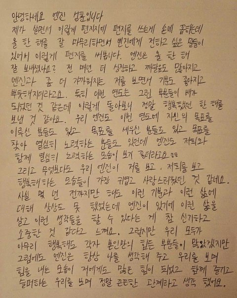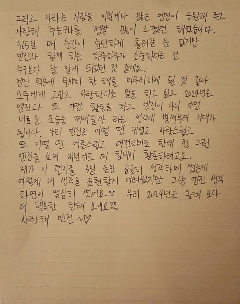 요즘 거의 매일 위버스 출석하고 자주 1시간이상 라이브키고 원래 카톡도 2글자이상 안쓰는 남자가 엔진에게 2장 손편지 쓴게 너무 감동임 ㅠㅠ 성훈이 진짜 엔진에게 진심인 남자야~