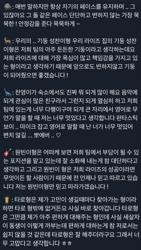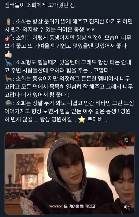 이건 소희가 멤버들에게 고마운 점 말한건데 오글거릴 수 있는 말도 되게 담백한데 진심은 묻어나오게 잘 말하고 옆에 있으면 진짜 좋을 사람같다