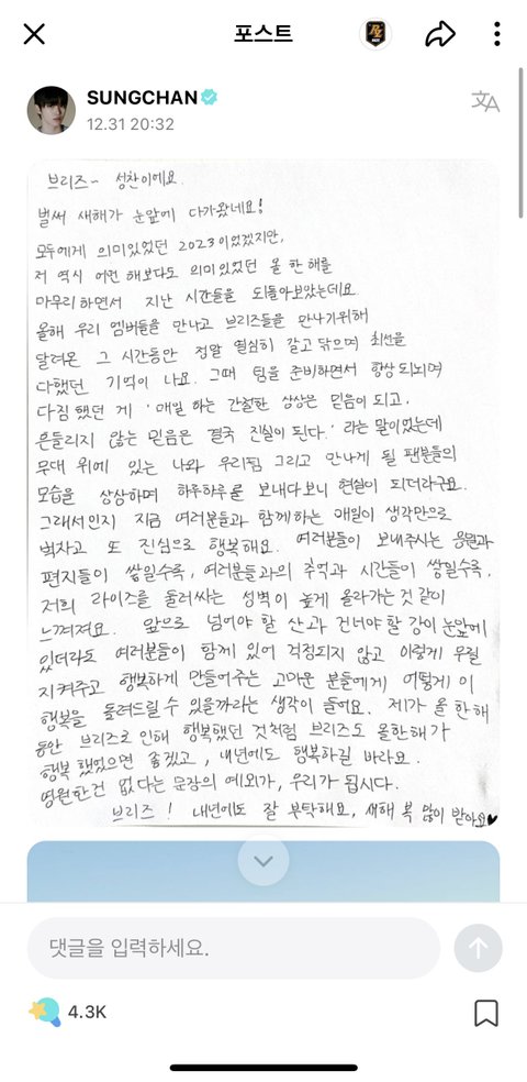 성찬은 엔시티 때도 무슨 날마다 자필로 뭐 써주는거ㅋㅋ귀여움