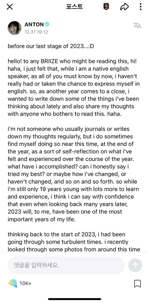 심지어 앤톤 영어로 저렇게 쓴거 번역기 돌려보니까 되게 심도있는? 어려운 어휘 많이 쓰면서 진지한 편지 썼던데 아무래도 한국어로 하면 어휘력을 잘 구사 못해서 그런거같음 ㅜ 감동