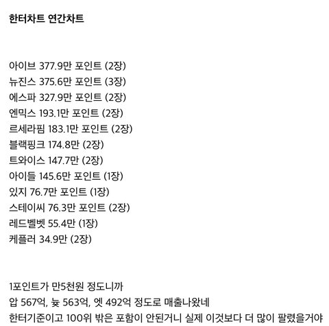 https://www.hanteochart.com/chart/album/yearly 아이브 뉴진스 에스파 르세라핌 아이들 블랙핑크 트와이스 있지 엔믹스 스테이씨 케플러