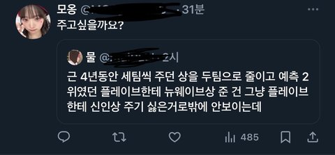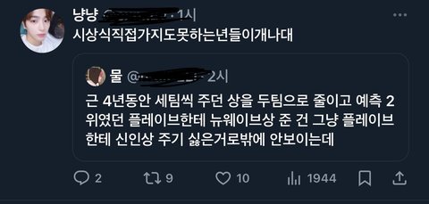 ㄹㅇ 궁금해서 물어봄 타팬들은 플레이브팬이 남긴 트윗에서까지 저 ㅈㄹ을 하는거임?? 지네 아이돌 욕한것도 아닌데 투표 오지게 열심히 했고 예측 2위면 기대할만 하잖음 지네들 가수 상탄거나 실컷 축하하지 플레이브팬이 억울하다고 적은 트윗에서까지 저러는거 조카 없어보임 아닌척 견제 오지게함 진짜로ㅋㅋㅋㅋㅋㅋㅋㅋ 자기 아이돌 얼굴달고 저러고 싶나