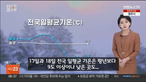 (사진1~2 설명) 연합뉴스TV 이남규 • 장혜린 앵커가 진행하고, 구본아 기상캐스터가 보도하는 12월 23일 오전 '토요와이드(8시 ~ 9시50분)' 방송화면 캡처