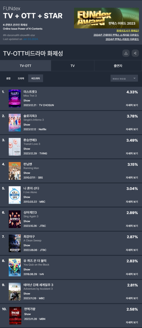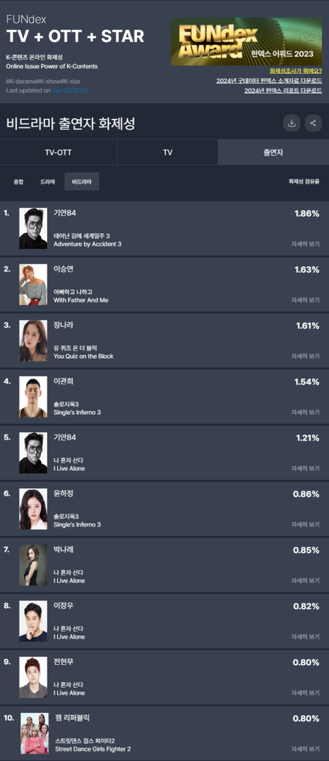 K-콘텐츠 경쟁력 분석 전문 기관인 굿데이터코퍼레이션의 공식플랫폼 펀덱스에서 1월 2일에 발표한 이번 순위는 2023년 12월 25일부터 12월 31일까지 방송 또는 공개 중이거나 예정인 TV비드라마와 OTT 오리지널 비드라마 그리고 각 프로그램에 출연한 출연자과 게스트를 조사 대상에 포함하였다.