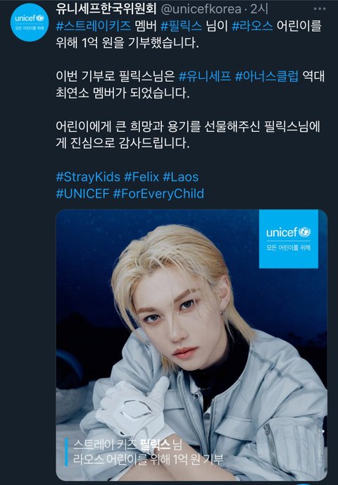 스키즈 필릭스 유니세프에 1억 기부했대!!