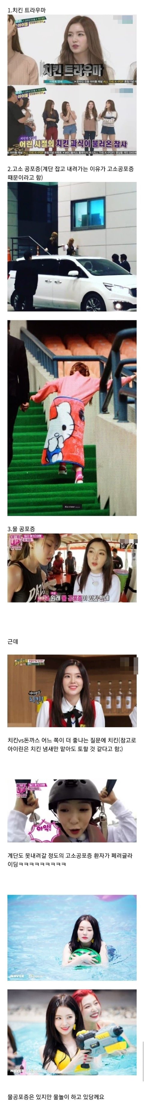 이건 개억까다ㅋㅋㅋ 말로는 돈까스보단 치킨 이랬지만 치킨 어렸을 때 체한 이후로 아예 먹은 적 없음 멤버들 치킨 먹을 때 혼자만 안 먹음. 또 고소 공포증은 있지만 무서워하면서 탈 수는 있음. 이건 나도 그럼. 물 공포증은 깊은데 못 들어가는 거지 낮은 수영장 같은 데는 들어갈 수 있음. 진짜 적당히 해라 연예인 죽이려고 작정했냐ㄷㄷ 일단 피뎁 땀 ㅅㄱ들