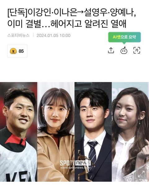 5일 스포티비뉴스 취재에 따르면 이강인과 이나은, 설영우와 양예나는 모두 이미 헤어진 상태로, 결별한 후 열애 사실이 알려진 것으로 알려졌다.