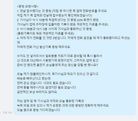 Q: 그럼 11시 15분에 기사님이 픽업하신 기록도 주세요. 전화 다 녹음되고 있으니까 정확하게 증빙 못 하시면 제가 어디든 제보합니다 뉴스에도 올리구요A: 알겠습니다