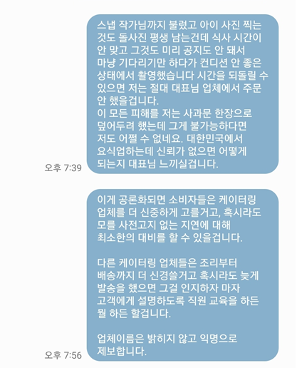 음에는 음식이 늦은 것이 문제가 됐지만, 그건 이미 지난 일이고 업체에서 인정하고 사과했으면 나는 이해하려 했는데 ㅠㅠ
