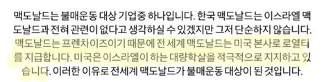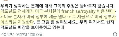 기업이 전세계 체인점에서 로열티를 받고 미국에 세금을 내는데 미국은 이스라엘을 지원하기 때문