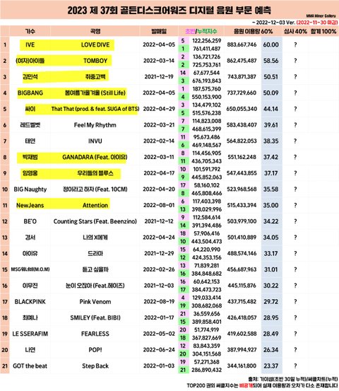 골든디스크 최근 3년간 음원 예측 / 실제 수상 결과