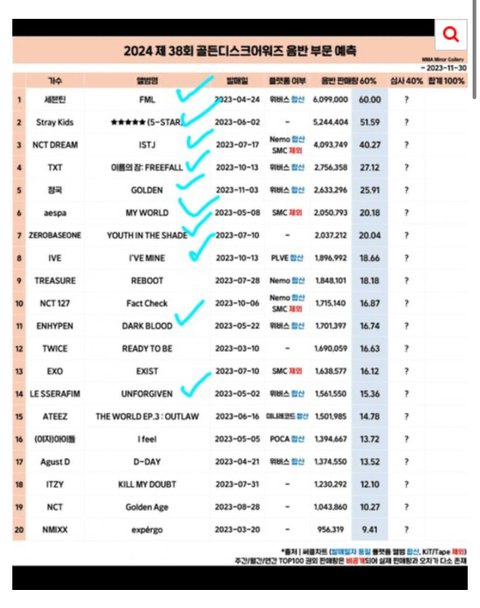 에스파 카리나 윈터 지젤 닝닝 엔시티 드림 마크 재민 제노 세븐틴 부석순 골디 골든디스크 하이브 SM 태연 뉴진스 레드벨벳 민지 칼국수