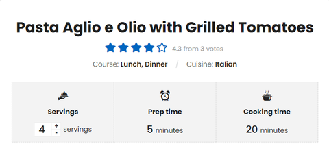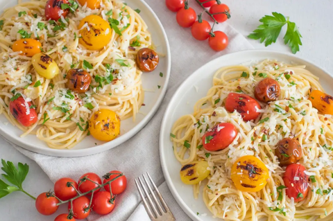 이 맛있고 매우 만족스러운 요리는 이탈리아의 고전입니다. 우리는 잘 익고 신선하고 약간의 스모키한 약간의 구운 방울토마토를 추가했습니다. 플레이팅을 마무리하는 것은 신선한 파슬리와 강판에 간 파마산을 약간 흩뿌리는 것입니다.