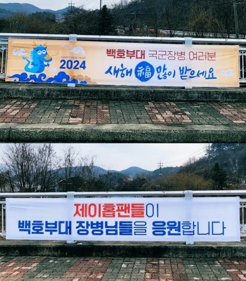 현수막에는 "백호부대 국군장병 여러분 새해 복 많이 받으세요", "제이홉팬들이 백호부대 장병님들을 응원합니다" 등과 같이 장병들을 응원하는 문구가 새겨졌다.