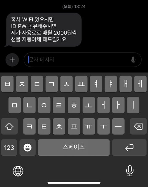 주차 문제는 어찌저찌 잘 풀었는데 갑자기 와이파이 있으면 공유해달라 달마다 2천원씩 이체 해주겠다 라는 문자가 왔어