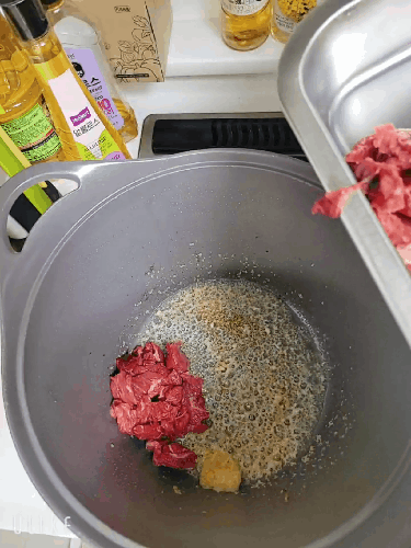 달군팬에 다진마늘1T 넣고 소고기230g넣고 볶아주세요