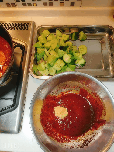 만들어둔 소스에 오이 양파넣고 버무려주세요