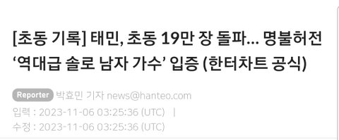 정식앨범 나오자마자 음원도 차트아웃이던데 스타성이 처참하네 ㅋㅋ 20만장 팔고도 자화자찬해주시고ㅋ 이렇게 망해도 까글 한번 안 올라오는 망돌 태민 ㅋㅋㅋ