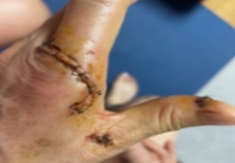 칼로 베인 많은 방어한 상처가 남아 있었습니다.