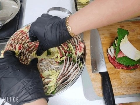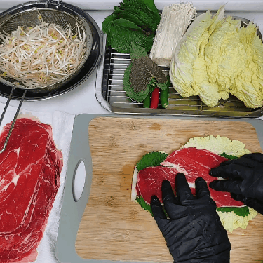 배추에 깻잎두장 불고기용 소고기 차례로 켜켜이 쌓아주세요