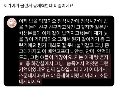 저따구로 낯가리는 애 처음 봄 같은 반 학생분들 ㅇㅈㄹㅋㅋㅋㅋㅋㅋㅋㅋ 너랑 동갑일텐데요... 굳이 화장실에서 먹은 이유: 애들이 밥먹고 반으로 돌아왔을 때 너 왜 빵먹어 배 안 고프다며 이러면서 따질 것 같아서