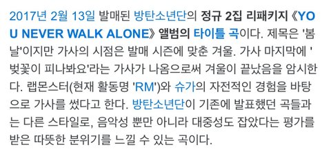 2017년 2월 13일 발매된 방탄소년단의 정규 2집 리패키지 《YOU NEVER WALK ALONE》 앨범의 타이틀 곡 봄날.