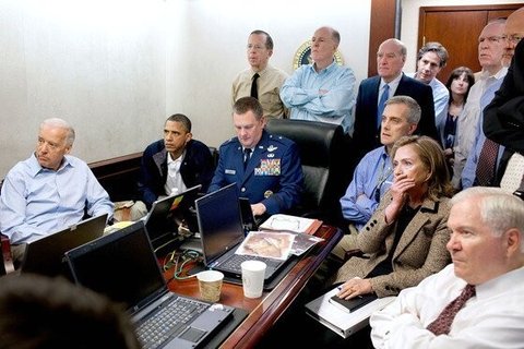 (사진2 설명) 지난 2011년 5월1일 밤(미국 동부시간) 미군 합동특수작전사령부 부사령관인 브래드 웹 공군 준장이 상석에 앉아 있고, 버락 오마바 대통령은 그 옆 작은 의자에 앉아 있다.
