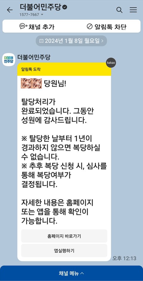 (사진5 설명) 릴레이 탈당 행사, 오리지날(진짜 정품) 탈당처리 완료 문자입니다(ㅋㅋ).