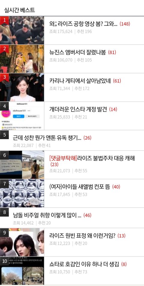 개심하긴 함 스엠 바이럴과 팬들의 광적인 영업의 콜라보임 판도 심하긴 한데 더쿠 가면 진짜 더더더더 심함ㅋㅋㅋㅋㅋㅋ 진심 과장 안 보태고 이게 라이즈 팬카페인지 뭔지 헷갈릴 정도임