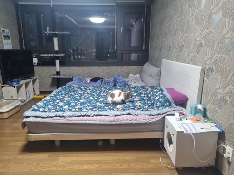 어느 날에는 퇴근하고 안방 불을 켰는데 항상 첫째 냥이가 있던 안방 침대에 베리가 누워 자고 있는거예요~