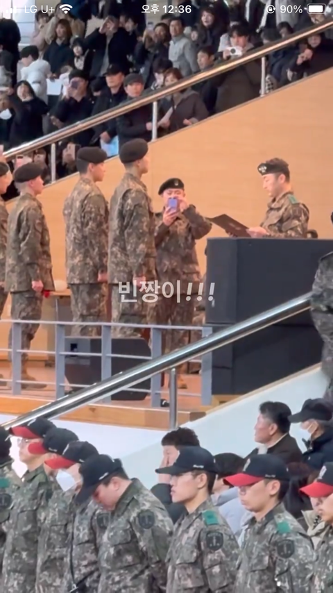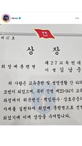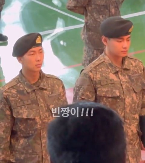 최정예 훈련병으로 뽑혀서 알엠 뷔 나란히 서서 상 받는거임. 참고로 최정예 훈련병은 중대별로 한 명씩 뽑는건데… 진짜 멋있는 듯. 심지어 한 명도 아니고 두 명다 나란히 서있잖아.