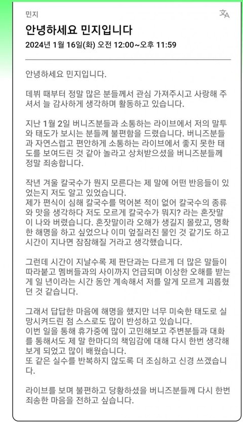 진짜 겨우 칼국수 하나로 일이 이렇게 커져서 사과문쓰는게 개불쌍하고 안타깝다 칼국수 모르는거 충분히 이해할수있고 뭐라할일도 아닌데 일년동안 시달린것도 말안되고 그 긴시간 민지가 욕먹은거에 비해 라방때 몇마디 한거가지고 미숙했던 점에 비해 또 죽일듯이 까고 뉴진스 글마다 칼국수 칼국수 거리면서 비아냥되는게 참..; 진짜 인간에게 정내미 떨어질정도..
