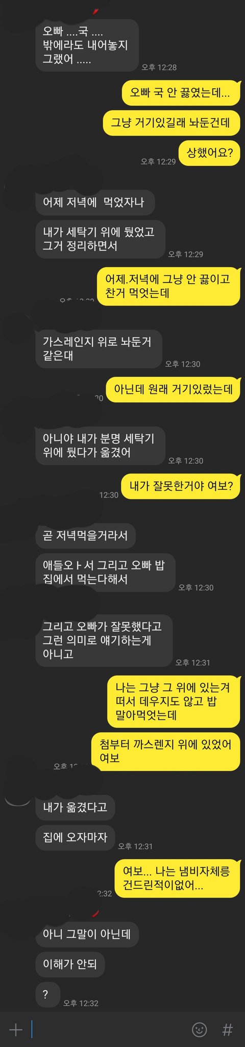 남편은 그냥 까스렌지 위에 있던 냄비에서 국을 덜어 늦은 저녁을 먹은 죄 밖에 없는데...