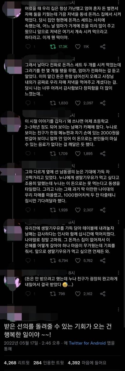 돈까스집 사장님은 좋은 분인데 능력도 안되면서 외상시킨 쓰니 엄마는 좀 그렇네. 그나마 부끄러움 고마움 알고 베푸는 쓰니는 잘커서 다행.