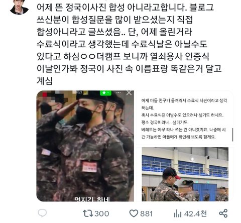 추반눌러줘 출처가 올팬이신 아미분 블로그야 다른 멤버 글도 올리고 잘못된 정보면 피드백도 하시고!! 정병ㄴ들 이제 하다하다 합성사진이라고 주작하는데 진짜 열폭에 미쳐서 뇌가 어떻게 된거 아님? 그리고 이분도 오죽하면 이렇게 글을 남겼을까.. 정병ㄴ들 정국이가 군대를 가도 집착하는거 불쌍해