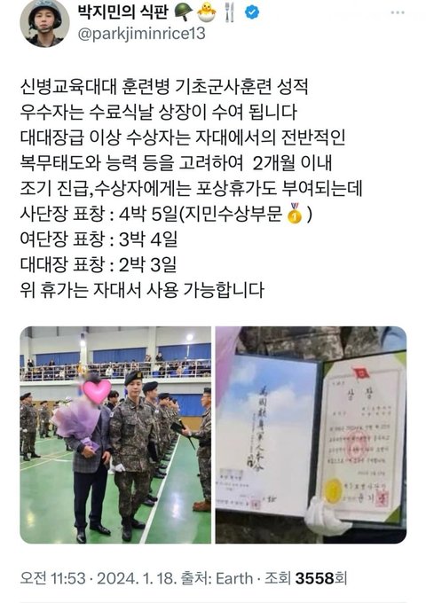 방탄 지민 종합1등 사단장 표창장 받고 수료했다는데