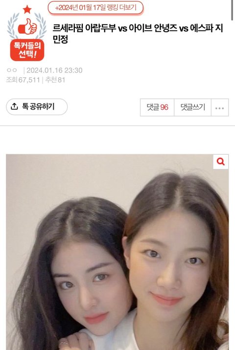 아이브 장원영 안유진 레이 에스파 카리나 윈터 뉴진스 민지 해린 스테이씨 시은 재이 아이들 슈화 미연 세븐틴 민규 원우 호시 엑소 백현 카이 세훈 방탄 정국 뷔 지민 블랙핑크 제니 지수 투바투 범규 연준 있지 류진 예지 아이유