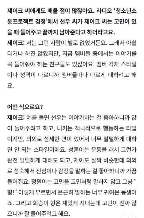 기본적으로 성격이 배려심 넘치고 다정해 너무 좋음 멤버들도 성향에 따라서 다르게 대한다는 인터뷰도 좋았음