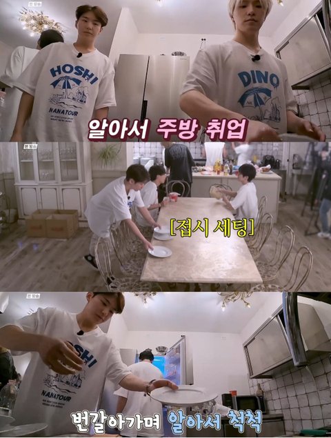 알아서 주방 취업한ㅋㅋㅋ 호시& 디노는 접시닦고 식탁세팅 들어감