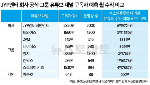 SNS(소셜네트워크서비스) 데이터 분석 업체 녹스인플루언서 기준 JYP엔터 공식 유튜브 채널 예측 월 수익은 6억9724만원입니다. 스트레이키즈 유튜브 채널이 4억7887만원, 트와이스는 3억1550만원, 있지는 2억763만원, 엔믹스는 1억6376만원, 데이식스는 3929만원, 2PM은 1311만원 순입니다. 소속사 공식 유튜브 채널의 예측 월 수익은 스트레이키즈보다 1.5배, 트와이스보다 2.2배 높습니다. 가장 적은 수익을 내는 2PM 보다 53.2배 많은 수익을 거두고 있습니다.