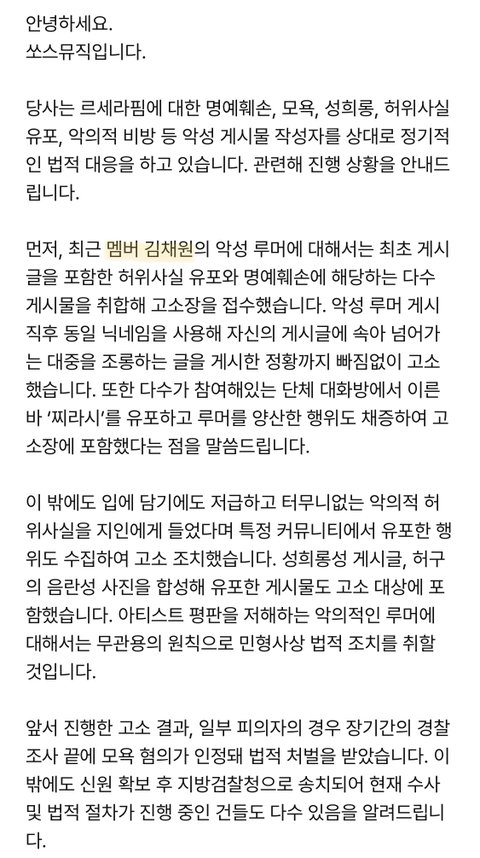 쏘스가 르세라핌 고소공지에 멤버 이름 직접 언급하면서 건들지말라 경고한거 김채원이 처음인데 ㅋㅋ
