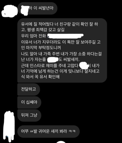 위 사례들 외에도 조카가 친구들 만나러 갈때면 한여름에도 긴팔,긴바지를 입게 해서 증거사진을 찍게하고,마트를 갔다고 하면 영수증을 찍어서 보내라고 하고,조카의 인스타로 로그인해 조카의 지인들에도 폭언을 일삼으며,자살을 하겠다, 조카에겐 자살을 종용하는 등의 카톡을 보낸걸