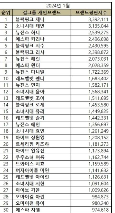 1. 블랙핑크 제니 2. 소녀시대 태연 3. 뉴진스 하니 4. 에스파 카리나 5. 블랙핑크 지수 6. 블랙핑크 리사 7. 뉴진스 해린 8. 에스파 윈터 9. 뉴진스 다니엘 10. 레드벨벳 웬디