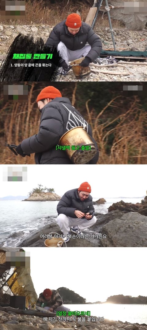섬에 떠밀려온 해양쓰레기로 이것저것 만들고 채집하고 불 피우면서