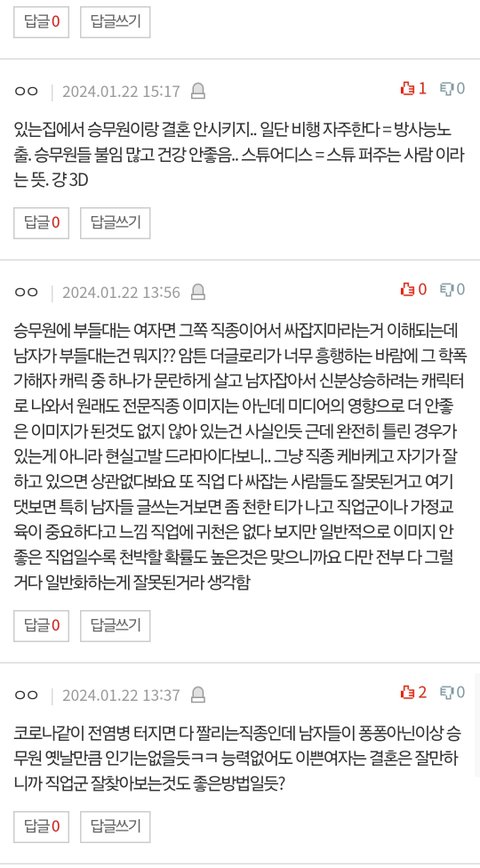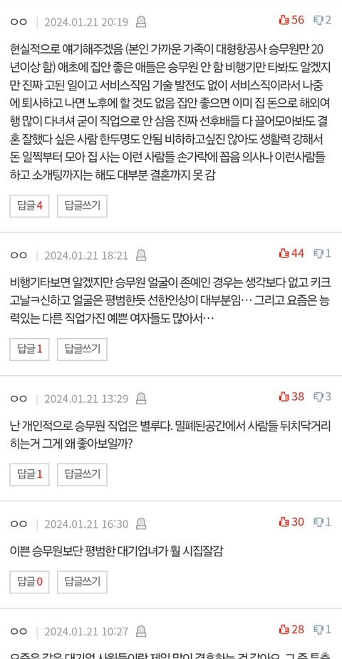 전문대 항공과 나와서 21살에 메이저 항공사 취직하고 올해로 10년차 된 사람인데 어려서부터 입사해서 악착같이 돈 모아서 20대에 서울에 등기치고 매년 1년에 한번씩은 직원티켓으로 부모님 해외여행 시켜드리면서 나름 만족하고 감사하며 다니고 있고 착실하게 지내는데 왜들 저렇게 문란하게 보는지 이해가 안됨 승무원들 착한사람 진짜 많고 얼굴 평균이상에 외국어도 평균이상에 특출나게 잘난직업은 아니어도 저렇게 __니 뭐니 까일 직업 전혀 아님 어제도 환자 승객 응급처치 해드리며 보람 느꼈고 영어 못하는 중국손님께 배운 중국어로 의사소통해서 공항에 손님이 놓고 온짐 찾아줘서 보람 느낌 뭘 그리 자기들한테 큰 잘못을 저질럿길래 죽일듯이 까대는지 이해할수 없음 승무원이 시집을 잘가든지 못가든지 무슨 상관..? 만족하는 사람들이 많으니 50넘어서까지 승무원하지 참고로 우리회사 평균 승무원 나이는 2023년 기준으로 37.8세 였다는걸 어제 통계표로 확인함 아무튼 남자들이 까면 여우의 신포도 여자들이 까면 질투로 넘기는게 속편할듯