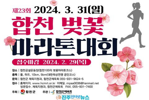 합천벚꽃마라톤대회본부(대회장 합천군수 김윤철)는 오는 3월 31일(일) 오전 8시 30분부터 합천공설운동장 출발하여 합천 100리 벚꽃길을 달리는 '2024년 제23회 합천벚꽃마라톤대회'를 개최한다.