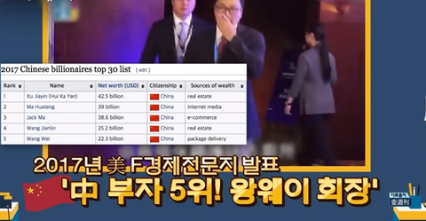 2017년 미국 경제지에서 발표한 중국 부자 5위에 오른 왕웨이 회장